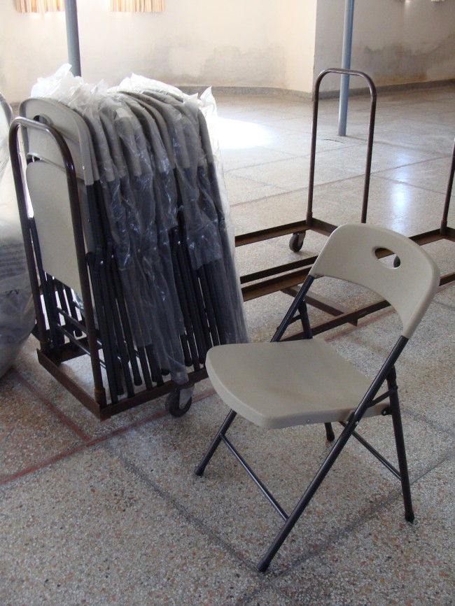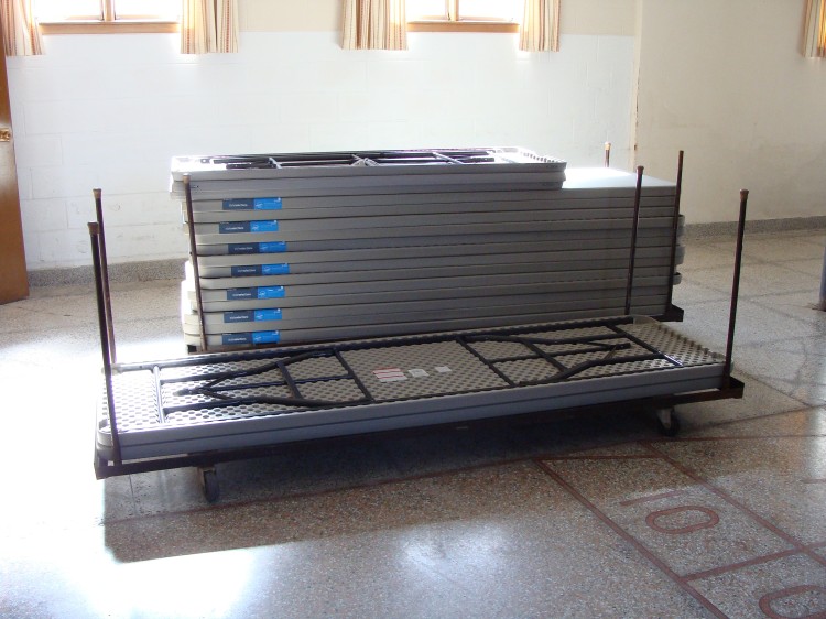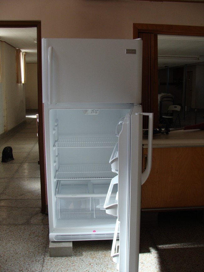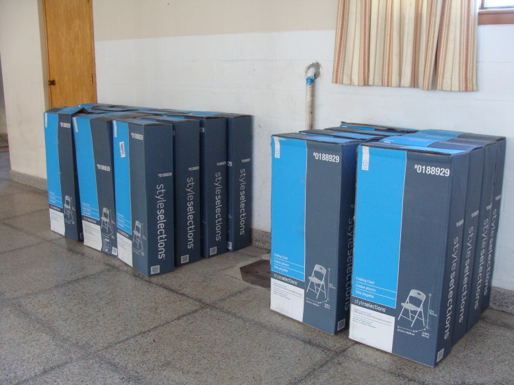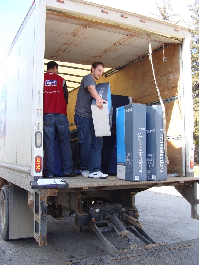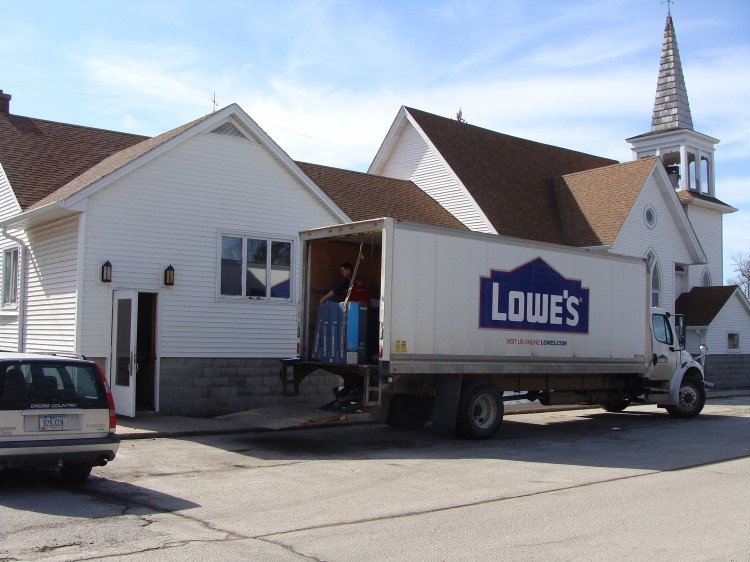 The truck from the Lowe's store in Ames delivers the items purchased for the church basement.