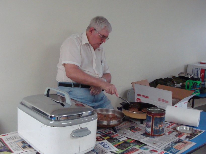 Verle is busy doing what he usually does, frying 40 pounds of sausage.