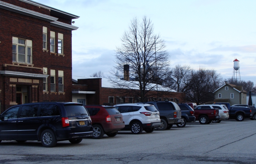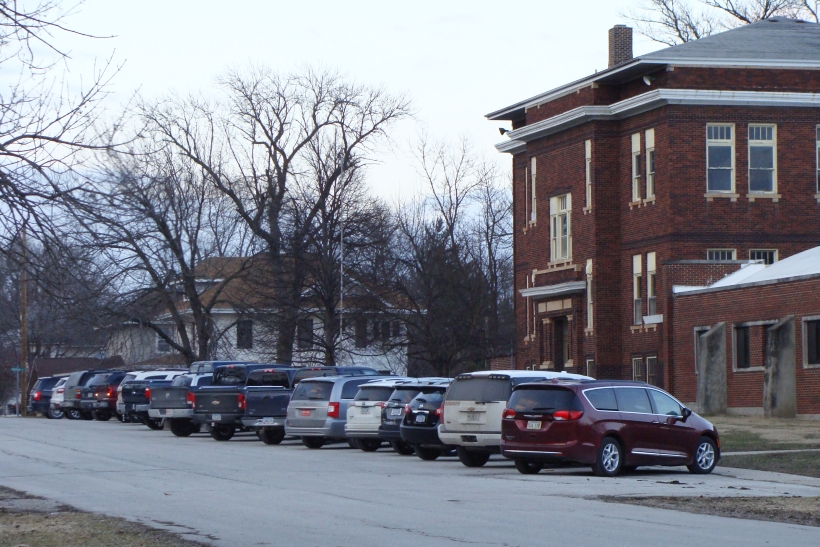 By 6pm, a row of vehicles is parked on the front (West) side of the Community Center Gym.