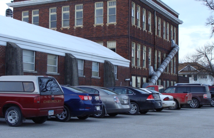 Vehicles of workers and guests are seen on the back (East) side of the gym.