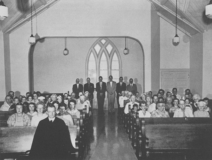 A congregational meeting was held in 1957 where it was voted to build a 50 foot addition to the church. Groundbreaking for this ambitious undertaking was on July 8. Much of the labor for that construction was donated. The basement was fitted with a terrazzo floor with a shuffleboard court, modern windows and doors, two furnaces, modern lighting and a well planned kitchen with a stack oven and stainless steel sinks. The women’s group purchased new dishes and flatware. The sound system and carpeting for the platform was also installed at this time. Three class rooms upstairs gave additional space for the growing Sunday School. They had vinyl floor covering and new windows. Vinyl floor covering was also installed in the nave.