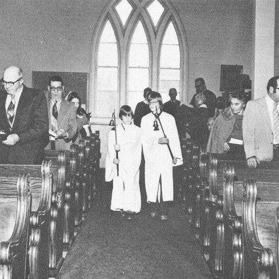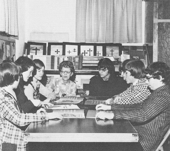 The Sunday School teacher in this 1975 photo was Genevieve Kuhfus, who was also the church organist. Genevieve served as organist for 50 years without missing a single Sunday worship service.