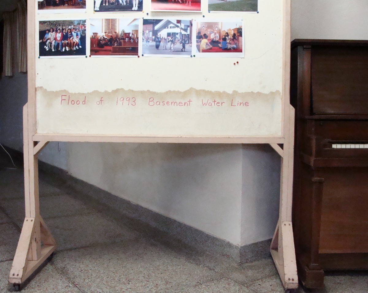 The general flooding throughout Ellsworth in 1993 brought water to a height of 29 inches in the church basement, ruining the the kitchen cupboards, the piano, water heater, and many other items. Because a few days of water soaking into the church basement display board, the dark portion seen above is a few inches higher than the 29 inch actual water level in that year.
