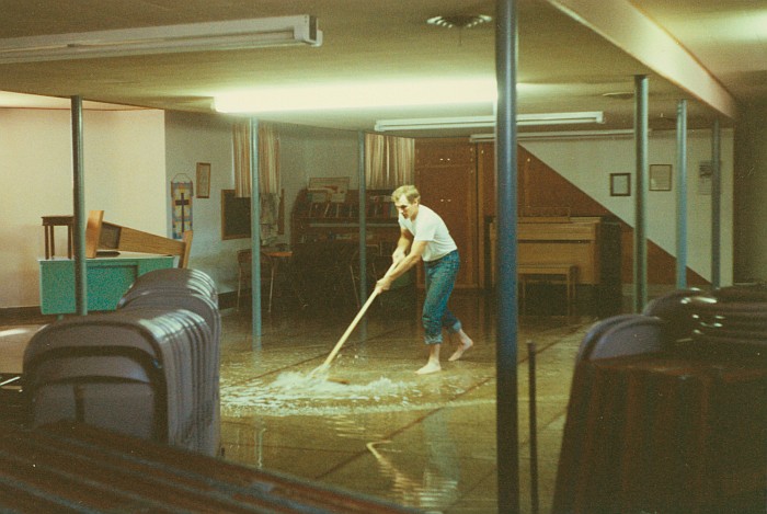 Kent Spohnheimer is shown draining the basement after an especially heavy rain in 1988.